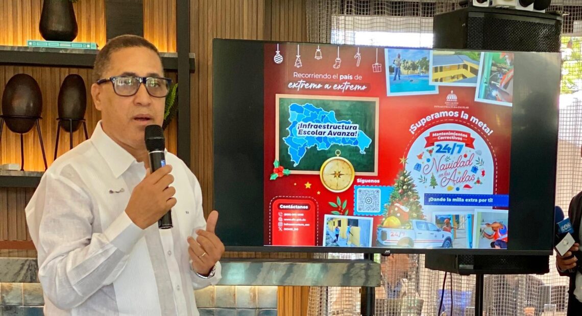 “Con gran orgullo y satisfacción hoy presentamos al país los resultados del programa «Navidad en las Aulas 24/7», que nos permitió remozar 311 planteles escolares, más de 1,800 aulas reacondicionadas con cambios de lonas asfálticas, reparación de los baños, pinturas, trabajos de electricidad, jardinería, entre otros. Con esto buscamos fortalecer y eficientizar la educación como ha instruido nuestro señor presidente Luis Abinader, con la confianza, el apoyo y la supervisión del señor ministro de Educación, Luis Miguel De Camps y con la firme convicción de seguir el impulsando las mejoras en el sistema educativo nacional”, declaró el titular de la DIE durante un encuentro con la prensa para dar a conocer el informe sobre la implementación del plan.