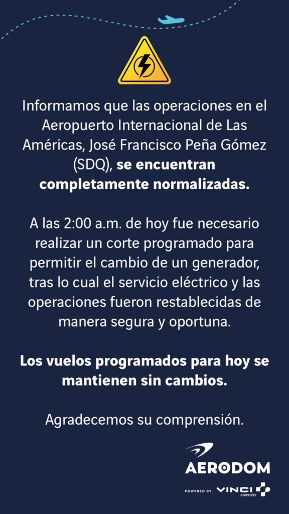 En cuanto al corte de la madrugada del lunes, la empresa lo describió como “programado”, realizado para permitir el cambio de un generador, asegurando que esta vez los vuelos se mantuvieron sin alteraciones en sus horarios.