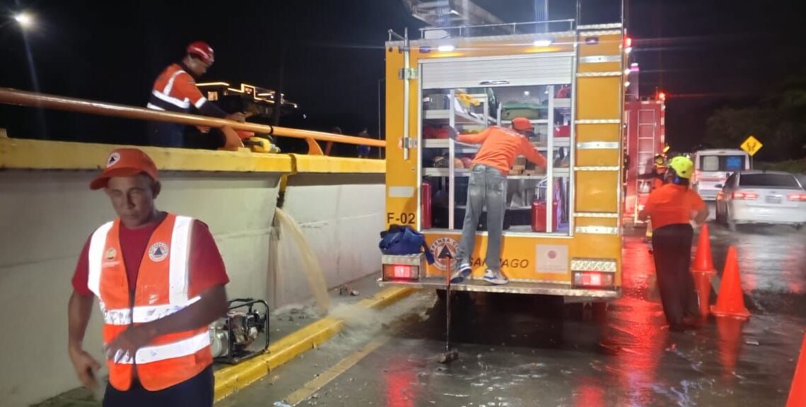 Santiago.- Personal de la Defensa Civil en esta provincia, junto a los bomberos locales, trabajó en la mitigación de las inundaciones que se presentaron en el elevado de la avenida Estrella Sadhalá y otras zonas de la parte urbana, debido a las fuertes lluvias.