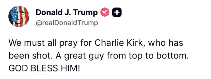«Todos debemos rezar por Charlie Kirk, que ha recibido un disparo. Un gran tipo en todos los sentidos. ¡Que Dios lo bendiga!», escribió el presidente Donald Trump en Truth Social.