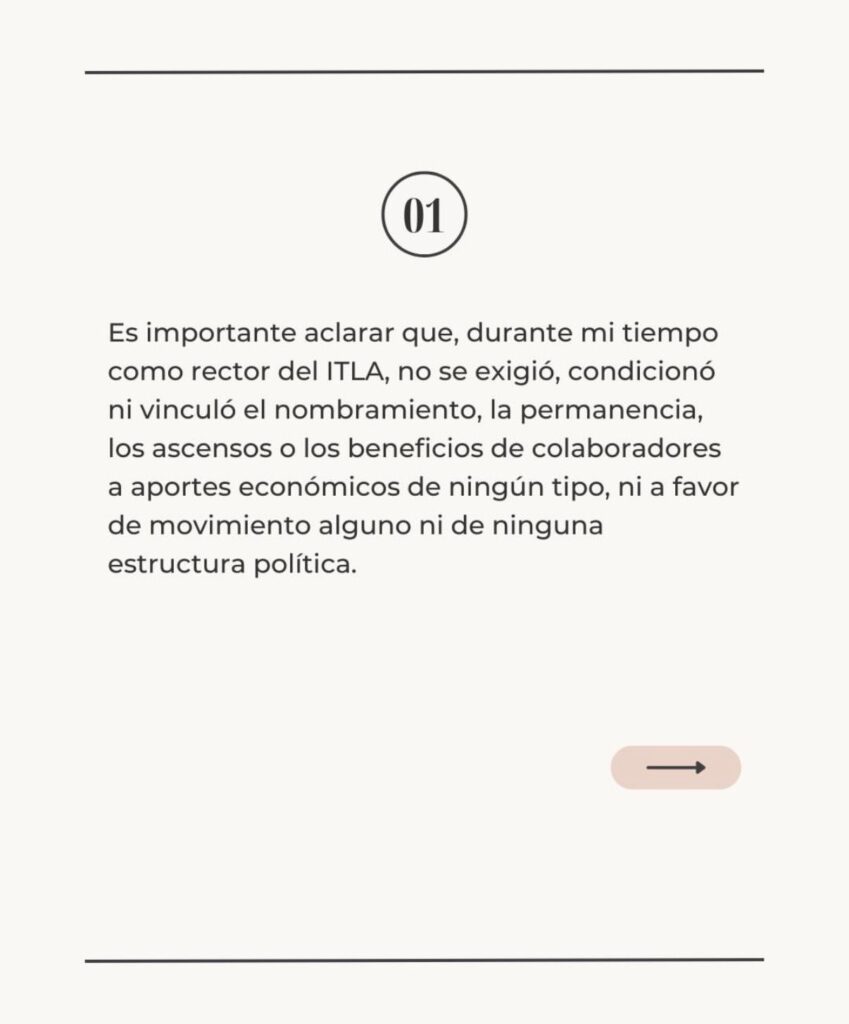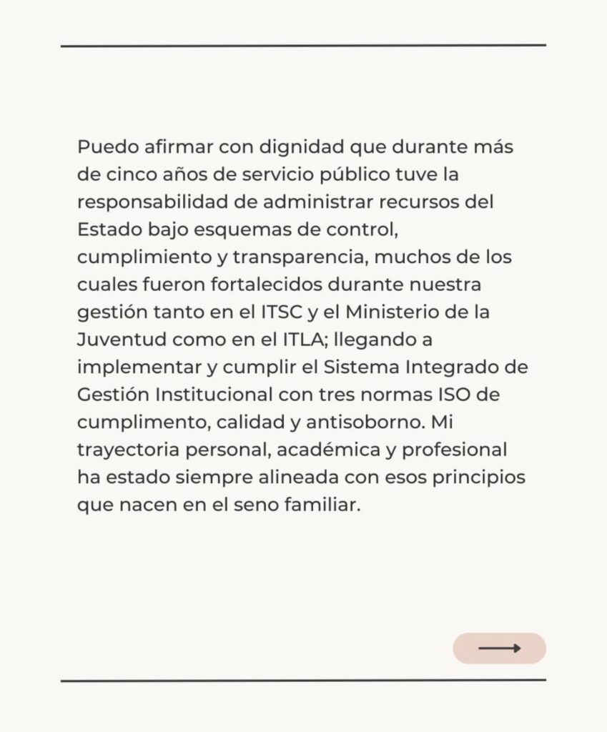 El exrector señaló que durante más de cinco años de servicio público tuvo bajo su responsabilidad la administración de recursos del Estado bajo esquemas de control, cumplimiento y transparencia, tanto en el Instituto Técnico Superior Comunitario (ITSC) como en el Ministerio de la Juventud y el ITLA, donde indicó que se implementó el Sistema Integrado de Gestión Institucional con normas internacionales ISO en calidad, cumplimiento y antisoborno.