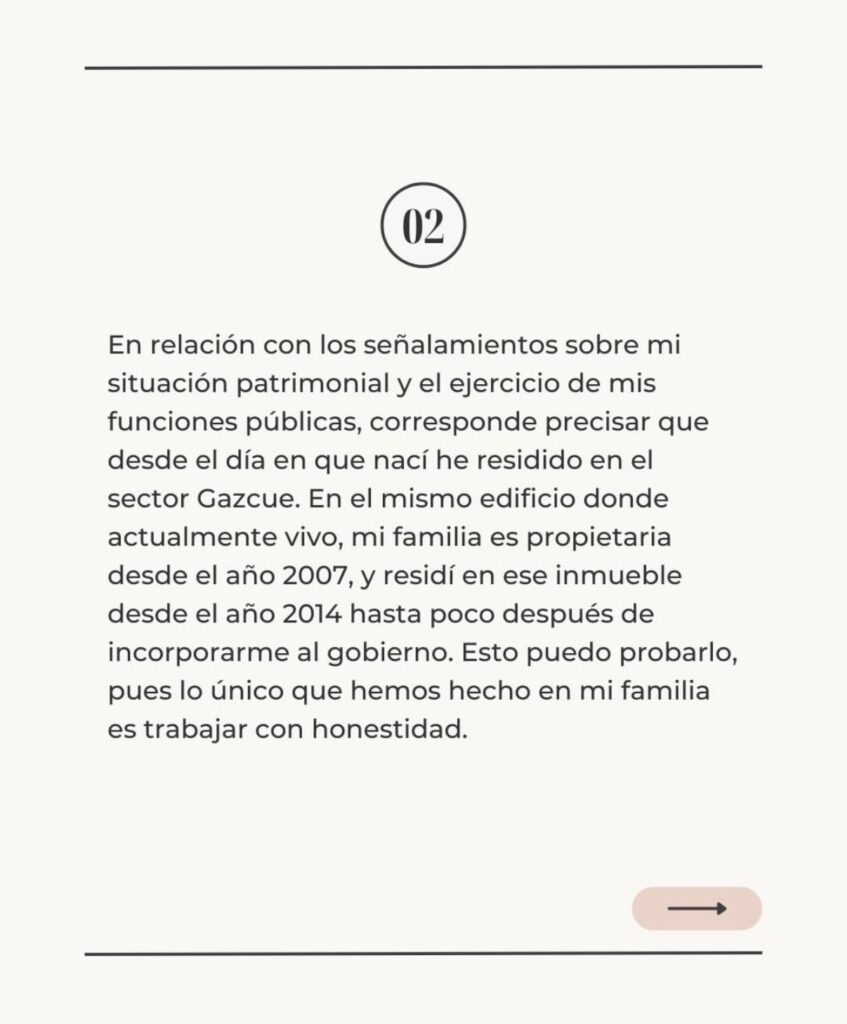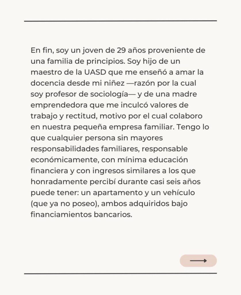 En relación con los señalamientos sobre su situación patrimonial, explicó que desde su nacimiento ha residido en el sector Gazcue, en el mismo edificio donde su familia es propietaria desde 2007. Detalló que en 2023 adquirió en ese inmueble un apartamento de dos habitaciones, contiguo a la vivienda de sus padres, por un valor aproximado de RD$10.7 millones, mediante una operación crediticia ordinaria financiada en un 80 % con un préstamo hipotecario y en un 20 % con un préstamo personal.