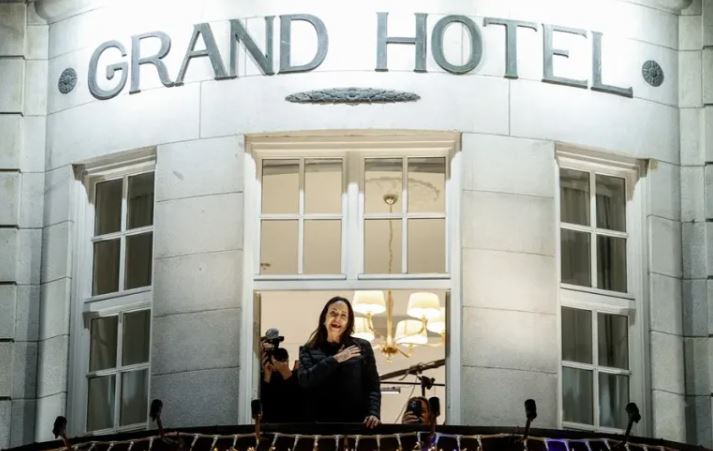 La líder opositora venezolana María Corina Machado salió este jueves al balcón del Grand Hotel de Oslo tras llegar a la capital noruega, desde donde saludó ya de madrugada visiblemente cansada pero sonriente a sus seguidores y cantó el himno de su país con la mano en el pecho.