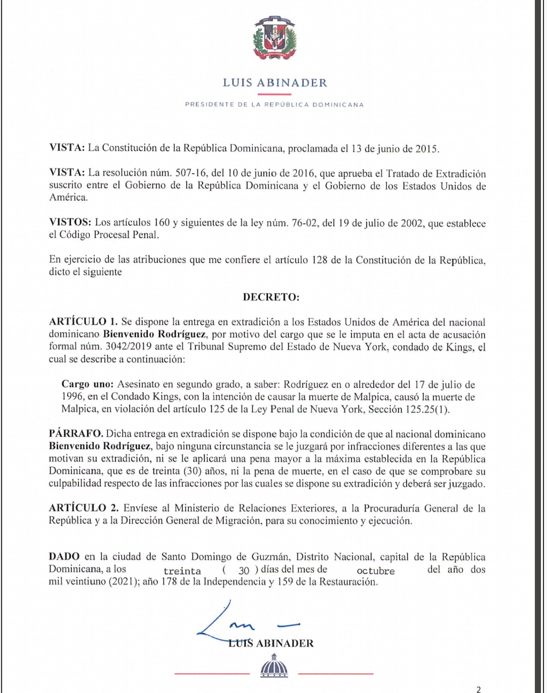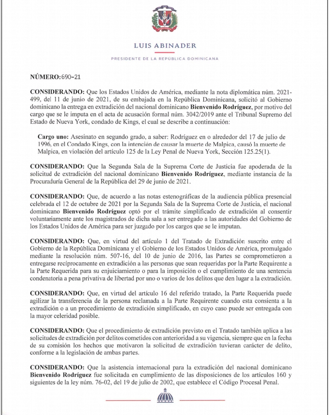 El presidente Luis Abinader emitió los decretos 689-21, 690-21 y 691-21, mediante los cuales se dispone la entrega en extradición de los dominicanos Gabriel Rosario Rodríguez, Bienvenido Rodríguez y Rafael Campos Martínez, quienes fueron solicitados por los Estados Unidos.