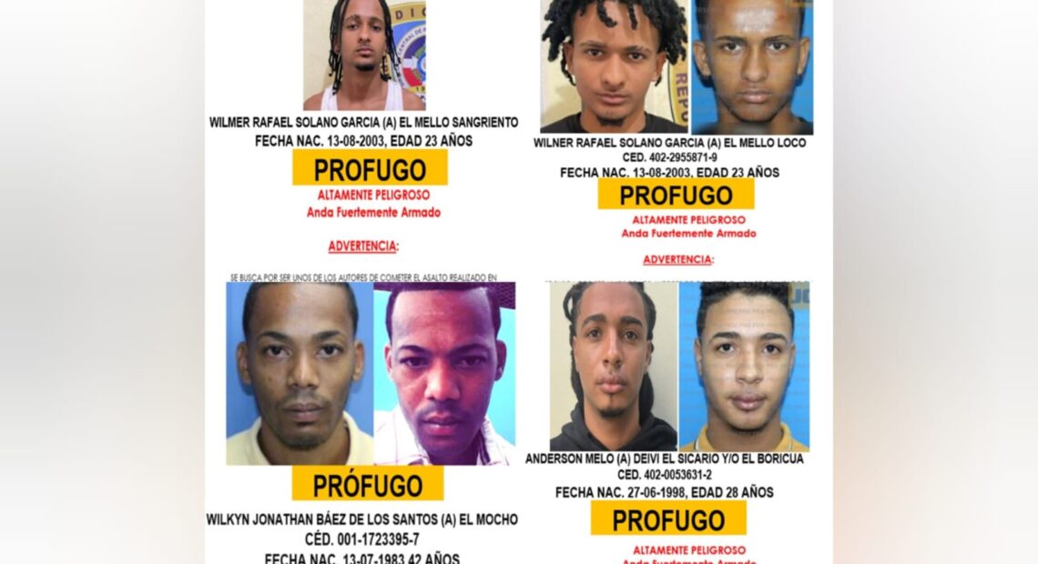 Entre los prófugos buscados figuran Wilmer Rafael Solano García (a) “El Mello Sangriento”, Wilner Rafael Solano García (a) “El Mello Loco”, Anderson Melo (a) “Deivi el Sicario” y/o “El Boricua”, y Wilkyn Jonathan Báez de los Santos (a) “El Mocho”, quienes son considerados altamente peligrosos y presuntamente se encuentran fuertemente armados.