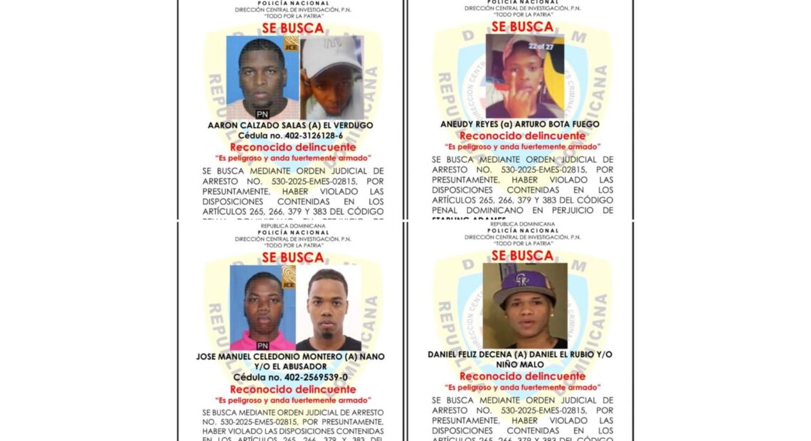 Los implicados fueron identificados como Aneudy Reyes (a) “Arturo Bota Fuego”, Daniel Feliz Decena (a) “Daniel El Rubio”, José Manuel Celedonio Montero (a) “Nano El Abusador” y Aron Calzado Salas (a) “El Verdugo”, todos señalados como altamente peligrosos y portadores de armas de fuego de distintos calibres.