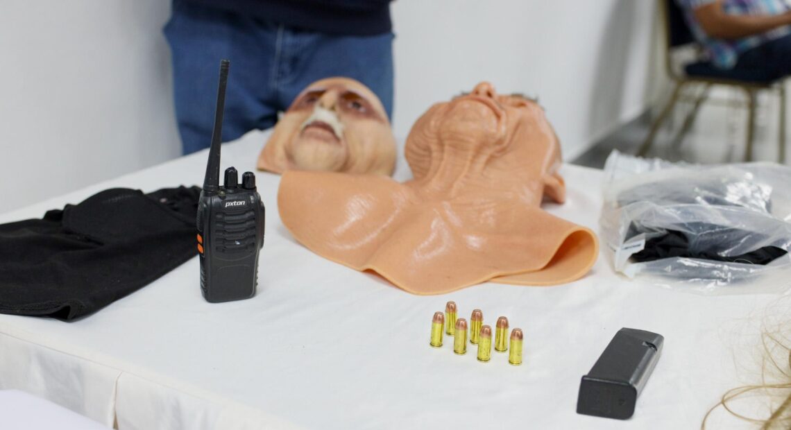 Entre los objetos colectados figuran tres máscaras con apariencia de personas envejecientes, dos pasamontañas y una peluca de mujer color rubio, artículos que habrían sido utilizados por los asaltantes para ocultar su identidad.