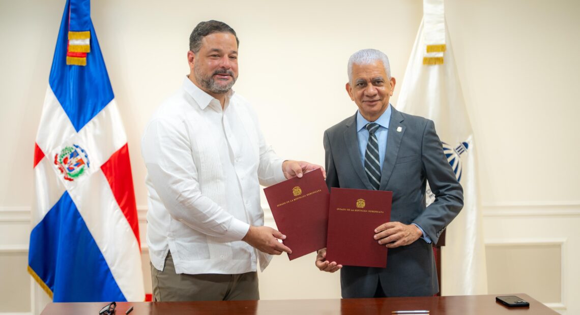 SANTO DOMINGO. – El presidente del Senado de la República y el ministro de Medio Ambiente y Recursos Naturales (MMARN) firmaron este martes un acuerdo de colaboración interinstitucional para coordinar esfuerzos a los fines de implementar un amplio programa integral de responsabilidad social y ambiental que fomente la conciencia ciudadana sobre la preservación del medio ambiente, capacitar a colaboradores del Senado y comunidades en las áreas de sostenibilidad.