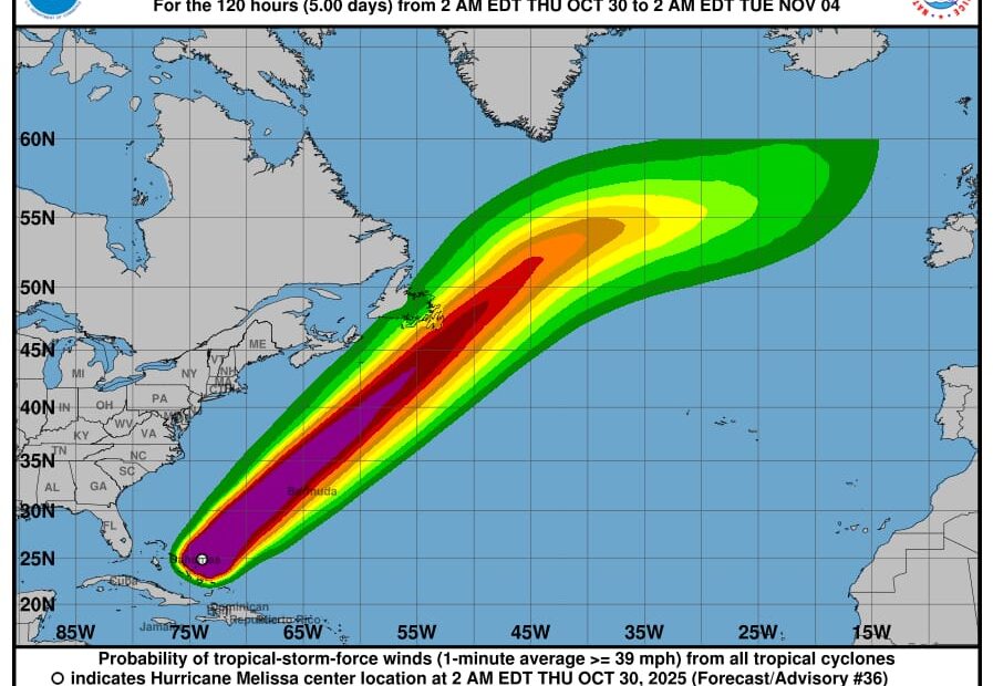 El Indomet precisó que el huracán Melissa, ahora de categoría 2 en la escala de Saffir-Simpson, se localiza aproximadamente a 345 km al noreste del centro de las Bahamas, moviéndose hacia el nor/noreste a unos 33 km/h. Mantiene vientos máximos sostenidos de 165 km/h y ráfagas superiores.